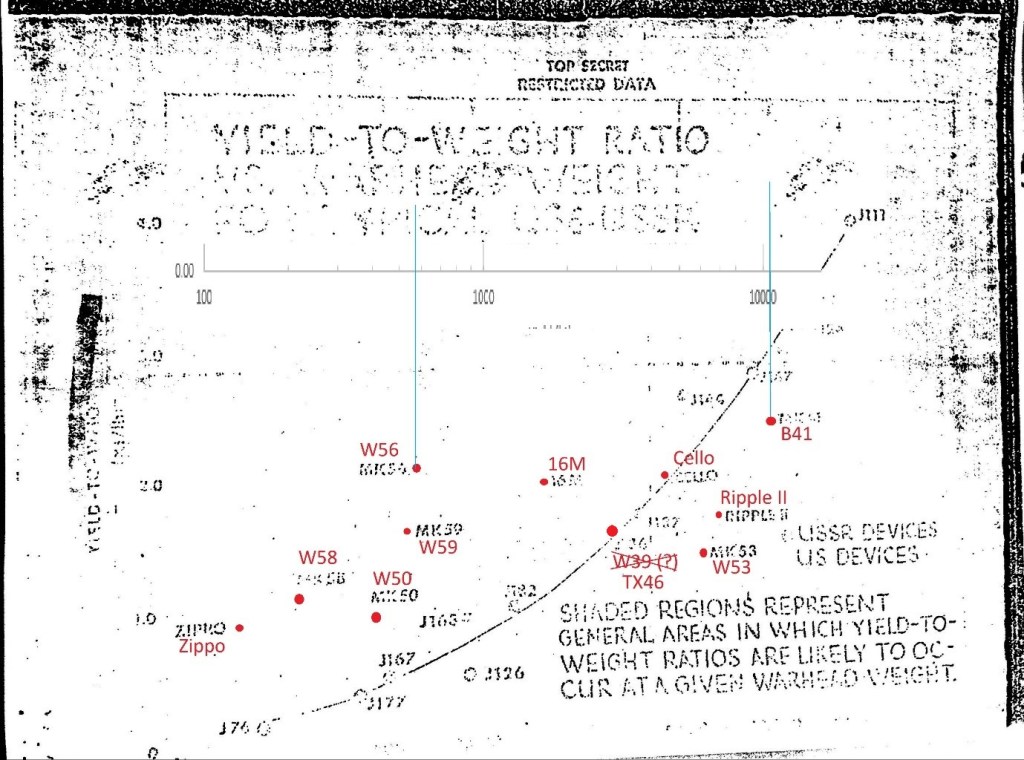 There is another graph on page 17, plotting warhead weight to yield to weight ratios of various weapons. I spent a while straining my eyes over this and have managed to name most of the US points on the graph, while also adding a scale. The blue lines represent the weights of two well known weapons, the W56 and B41, and are used to calibrate the scale.