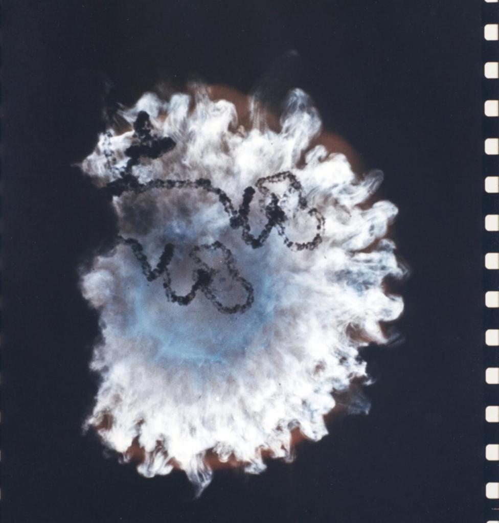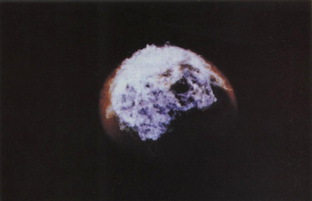Figure 3 — Fishbowl Starfish Prime (W49Y2) fireball. The black squiggles are shadowing caused by the rocket engine exhaust. Source: US DoD or AEC.
