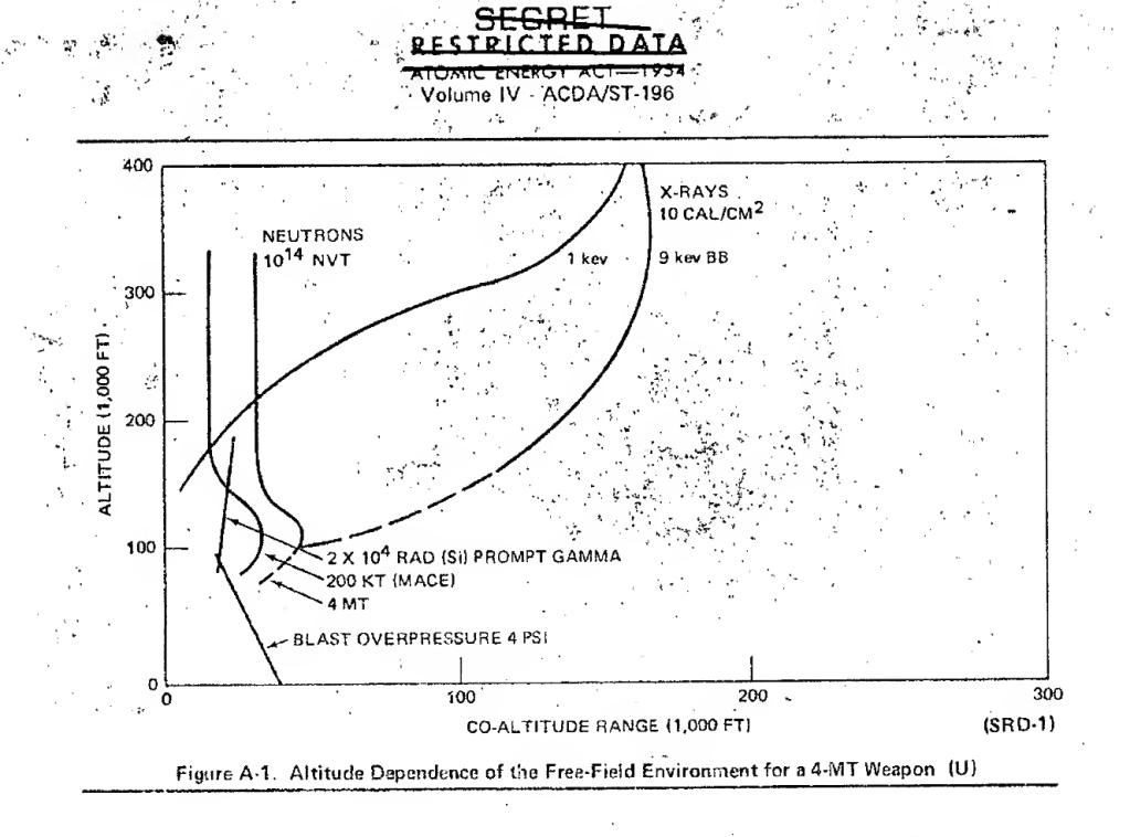 In the discussion of Mace, the most interesting part is on Page 65 where a graph of weapon effect distances for a 4 Mt weapon vs altitude are provided. The lines given include total neutron dose, 10 cal/cm2 x-rays exposure for both 1 keV and 9 keV x-rays, 2*104 Rad prompt gamma dose, and 4 PSI blast overpressure.